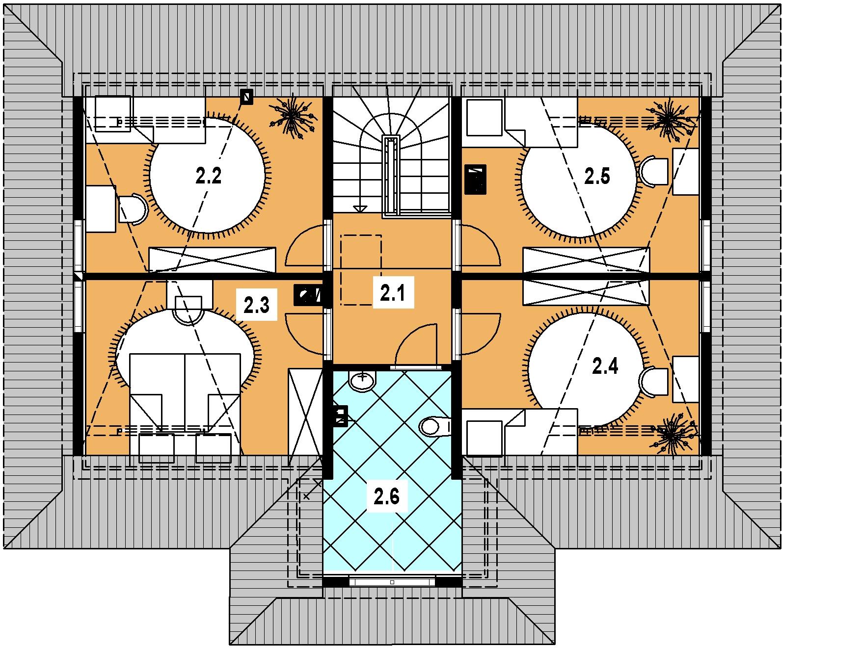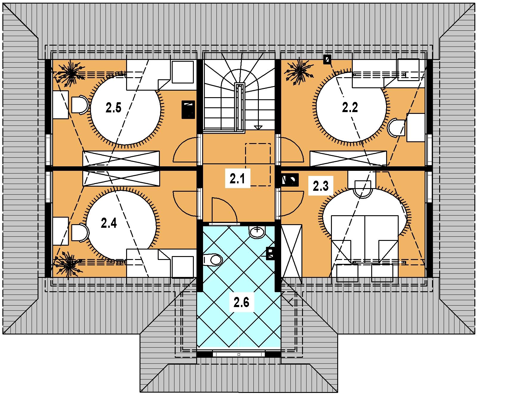 Cała strefa nocna została zlokalizowana na poddaszu. Projekt przewiduje cztery komfortowe sypialnie, które można dostosować do potrzeb domowników – jako pokoje dla dzieci, sypialnia główna czy dodatkowy pokój gościnny. Na poddaszu znajduje się także wygodna łazienka, w której można zmieścić zarówno wannę, jak i prysznic.