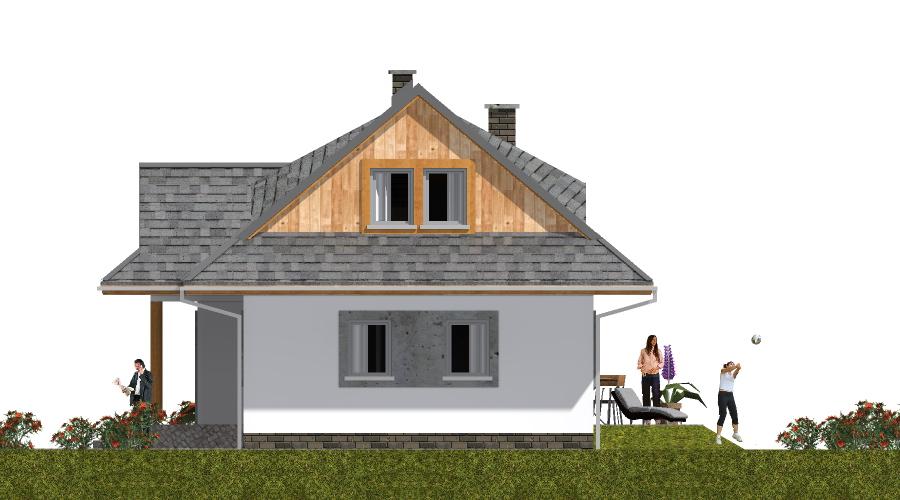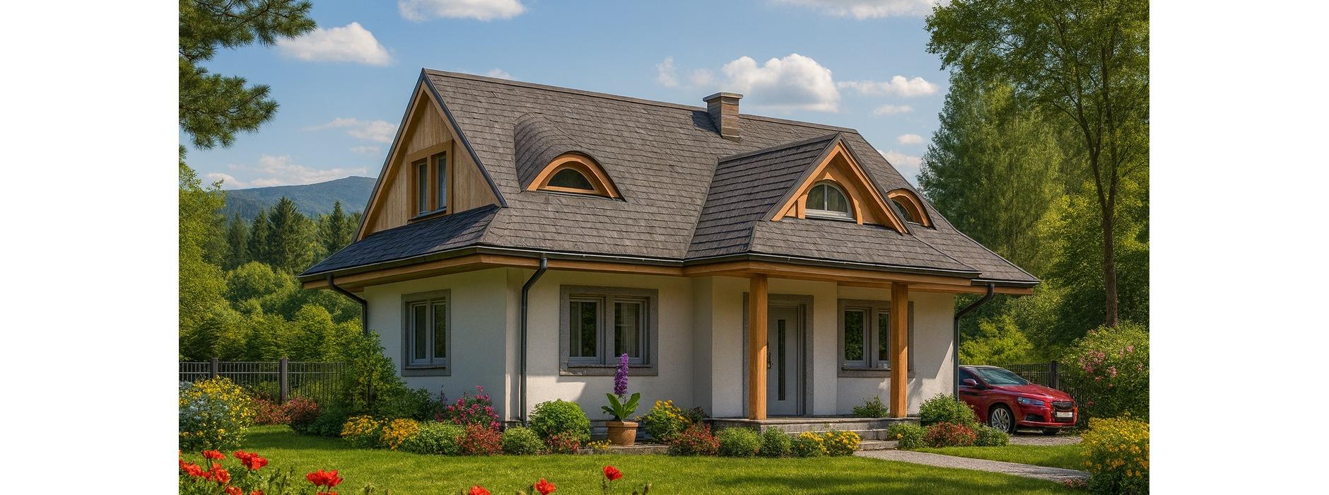 Projekt A-102 „DOM WRONIA” to wyjątkowy przykład, jak niewielki dom jednorodzinny parterowy z poddaszem mieszkalnym może łączyć tradycyjny styl góralski z nowoczesnymi rozwiązaniami funkcjonalnymi. Bryła budynku jest prosta i elegancka, a jej charakter podkreślają wolie oczka i przydaszki, które nadają całości klimatu inspirowanego góralską architekturą.
