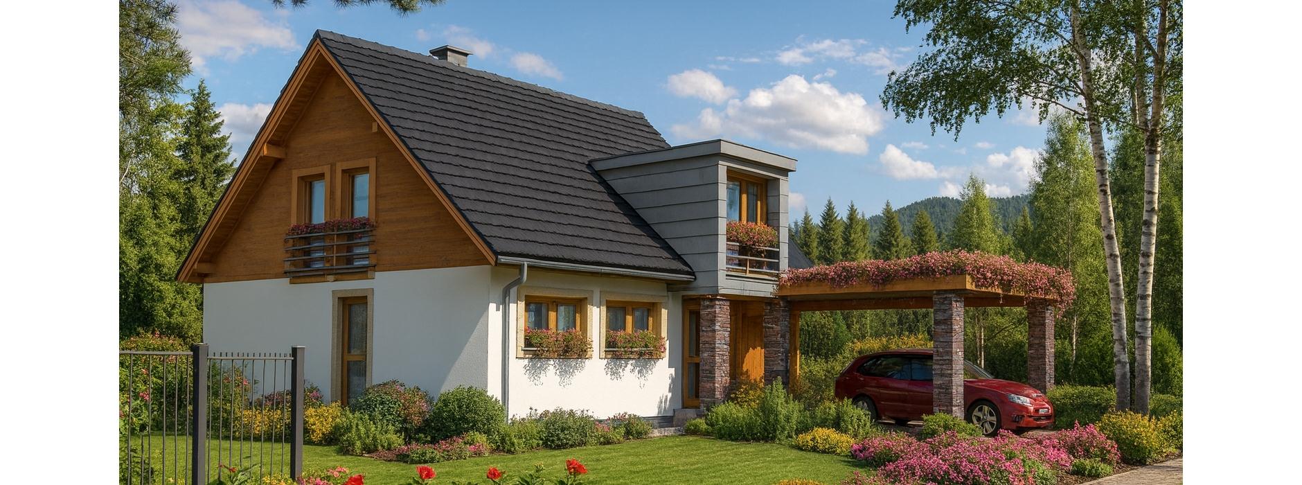 - nowoczesna architektura z elementami drewnianymi i blachą na rąbek,