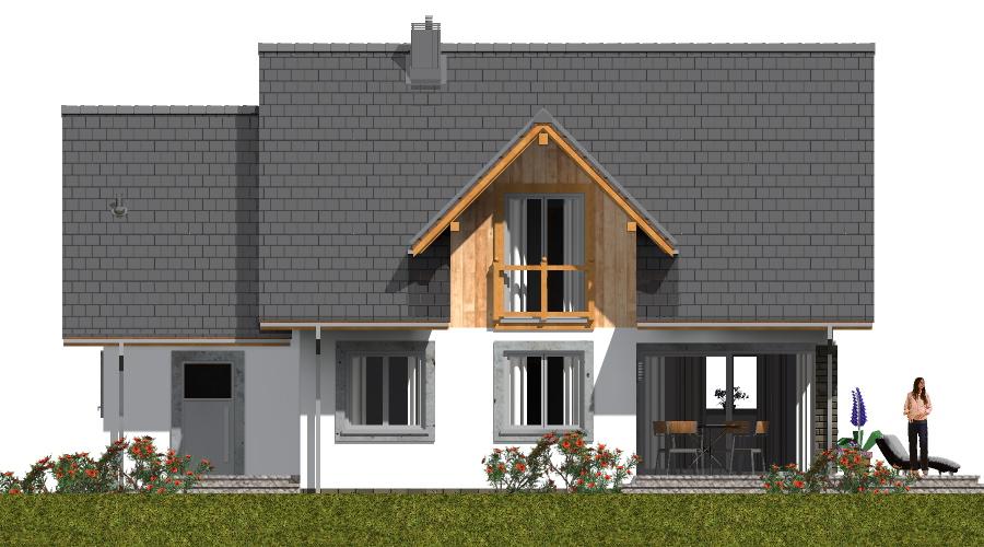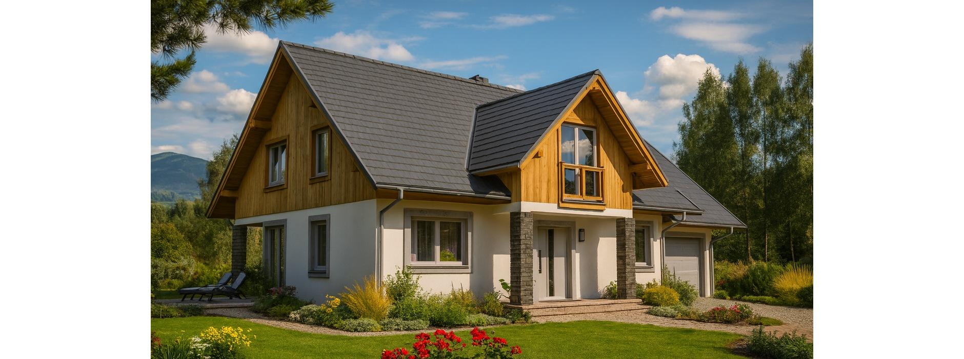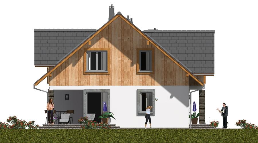 Nowoczesny dom parterowy z poddaszem w technologii szkieletowej Projekt tego domu szkieletowego z użytkowym poddaszem został stworzony z myślą o rodzinach 5-6-osobowych, które chcą mieszkać w funkcjonalnym i nowoczesnym domu szkieletowym. Kompaktowa bryła domu i inteligentny układ wnętrz sprawiają, że koszty budowy i eksploatacji są niewielkie. Minimalistyczna forma i duże przeszklenia Dom szkieletowy charakteryzuje się prostokątnym rzutem i dwuspadowym dachem, minimalistyczną formą oraz nowoczesnym wykończeniem elewacji. Duże okna zapewniają dużo naturalnego światła, dzięki czemu wnętrza są jasne i przyjazne, a mieszkańcy mają bezpośredni kontakt z otoczeniem. Przemyślany układ funkcjonalny Parter: przestronny salon z kuchnią i jadalnią, łazienka, spiżarka, garaż oraz pomieszczenie gospodarcze. To idealne miejsce do wspólnego spędzania czasu z rodziną. Poddasze: cztery sypialnie, łazienka i trzy garderoby zapewniają komfortowe warunki dla wszystkich domowników. Funkcjonalny taras i przestrzeń na świeżym powietrzu Dom szkieletowy został zaprojektowany z tarasem w kształcie litery L, który okala budynek z dwóch stron. To rozwiązanie zwiększa funkcjonalność przestrzeni zewnętrznej i pozwala korzystać z wypoczynku na świeżym powietrzu w komfortowych warunkach. Zalety domu szkieletowego szybka i ekonomiczna budowa dzięki prefabrykowanym elementom, doskonała izolacja termiczna i niskie koszty eksploatacji, funkcjonalny układ wnętrz bez marnowania przestrzeni, nowoczesny i estetyczny design z przemyślanym rozplanowaniem pomieszczeń. Ten dom parterowy z poddaszem w technologii szkieletowej to propozycja dla rodzin, które szukają nowoczesnego, funkcjonalnego i energooszczędnego domu, gwarantującego komfort i przyjemną atmosferę mieszkania.