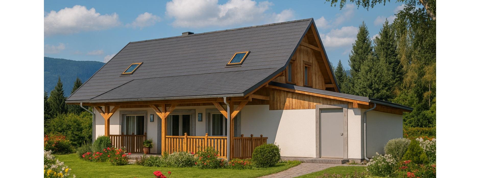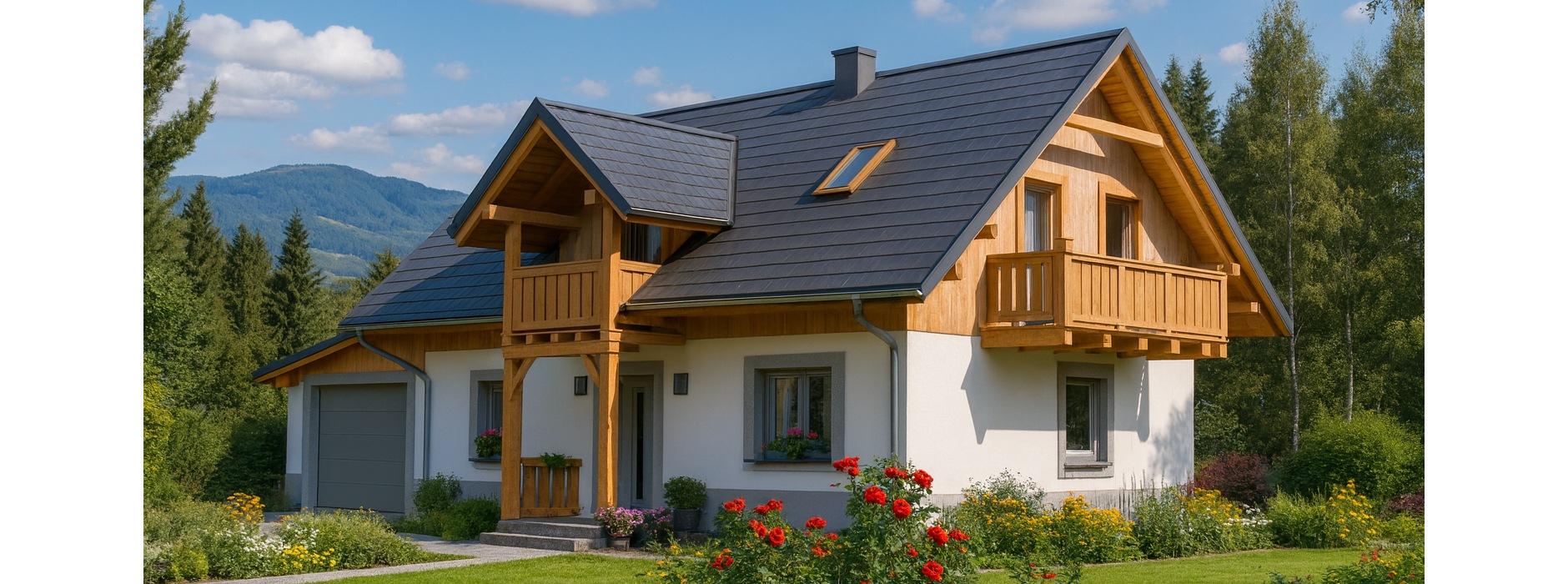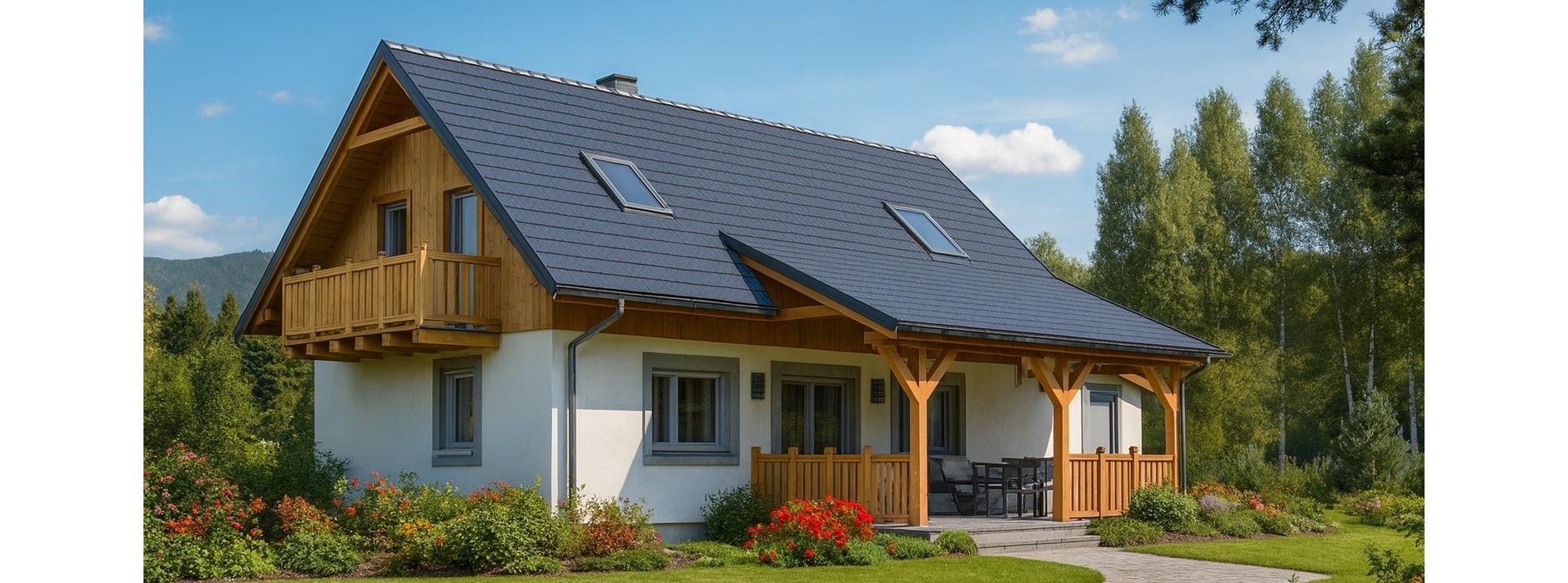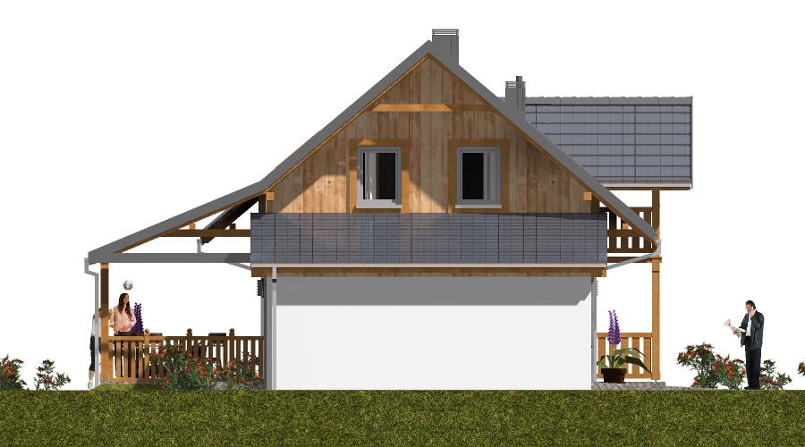 Ten parterowy dom szkieletowy został zaprojektowany jako dwuczłonowy budynek, który mimo podziału bryły tworzy spójną i nowoczesną całość. Wyraźnie zaakcentowane wejście nadaje mu charakter i wyróżnia na tle sąsiedniej zabudowy. Funkcjonalność wnętrza Dom umożliwia wygodne użytkowanie parteru, który zawiera: Sypialnię i łazienkę, idealne do codziennego użytku, Przestronną część dzienną z pokojem dziennym oraz kuchnią z aneksem jadalnym, Kominek, który pozwala dogrzać wnętrze w chłodne dni, Schody na poddasze, zaczynające się w pokoju dziennym, umieszczone z boku dla wygodnego połączenia stref dziennej i nocnej. Poddasze i funkcjonalność Poddasze może pełnić funkcję użytkową okresowo, Sypialnie na poddaszu mogą być wykorzystane jako gabinet, pokój gościnny lub przestrzeń rekreacyjna. Garaż i taras Duży garaż zapewnia miejsce na samochód i przechowywanie sprzętu, Wiata tarasowa umożliwia relaks na świeżym powietrzu niezależnie od warunków pogodowych. Zalety technologii szkieletowej Ekonomiczny i szybki w budowie dom, Doskonała izolacja cieplna i niskie koszty eksploatacji, Lekka i trwała konstrukcja, Komfortowy, ciepły i funkcjonalny dom dla całej rodziny.