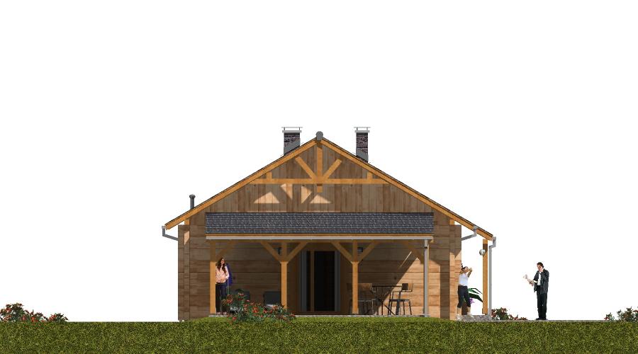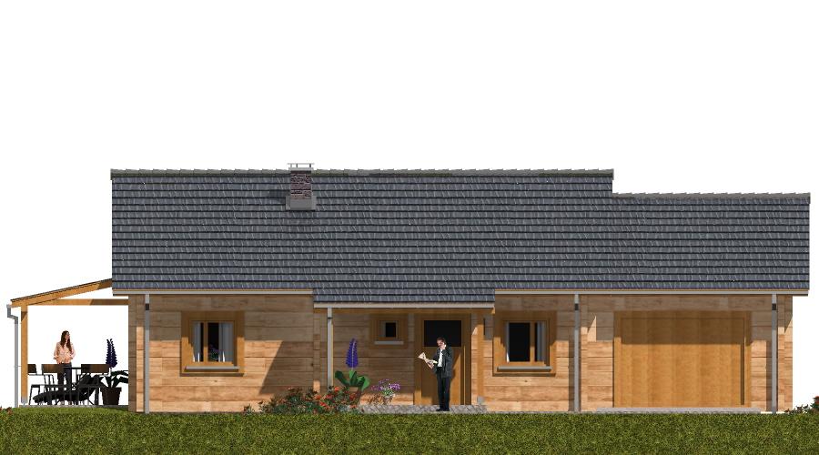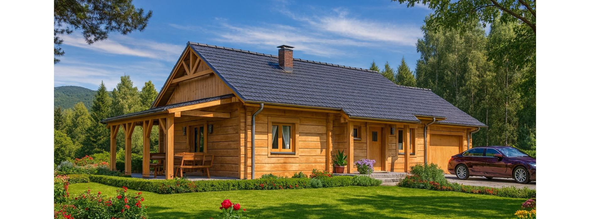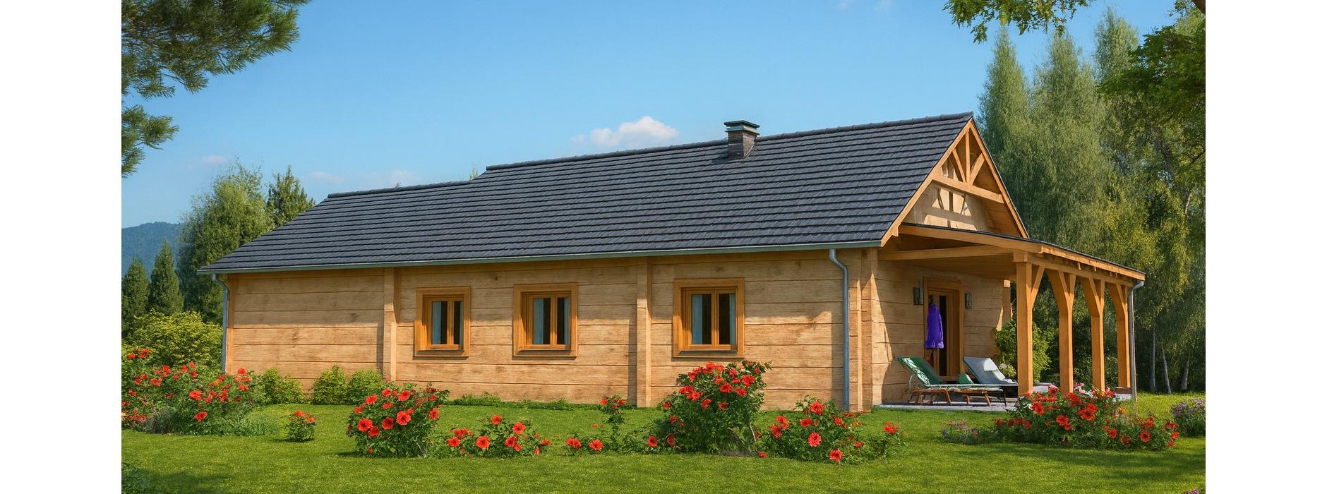 Ten parterowy dom z bala został zaprojektowany z myślą o rodzinach z dziećmi, które nie potrzebują ogromnych przestrzeni, ale cenią komfort, ciepło i przytulną atmosferę. Dzięki zastosowaniu drewna jako głównego materiału konstrukcyjnego, wnętrze domu ma wyjątkowy mikroklimat, sprzyjający codziennemu odpoczynkowi. Strefa dzienna W części dziennej domownicy mają do dyspozycji: Przestronny pokój dzienny z aneksem kuchenno-jadalnym, Miejsce na komplet wypoczynkowy, z którego widać kominek, zapewniający przyjemne ciepło w chłodniejsze dni, Miejsce na sprzęt audio-wizualny, np. komodę z telewizorem i sprzętem multimedialnym, Zadaszony taras z szerokim wyjściem z pokoju dziennego, co pozwala cieszyć się kontakt z otoczeniem niezależnie od pogody. Strefa nocna Przez hol prowadzi droga do części nocnej domu, obejmującej: Trzy komfortowe sypialnie, Łazienkę, Wszystkie pomieszczenia mają duże okna, dzięki którym wnętrze jest jasne i przytulne. Garaż i pomieszczenia gospodarcze Duży garaż znajduje się oddzielnie od części mieszkalnej, Może służyć również jako pomieszczenie gospodarcze i miejsce na narzędzia ogrodowe. Zalety technologii z bala Naturalny mikroklimat drewna, Doskonała izolacja termiczna i akustyczna, Estetyczny wygląd elewacji i wnętrza, Dom ciepły, przyjazny i ekologiczny.
