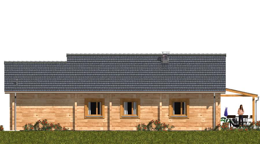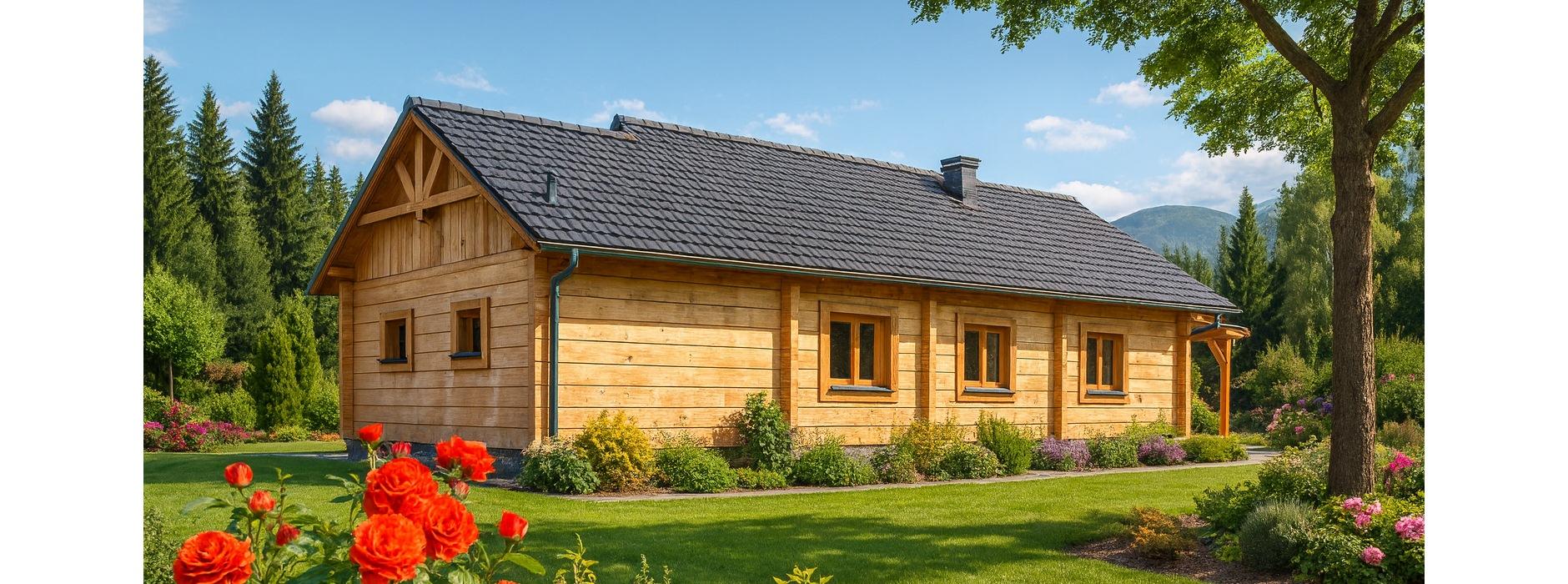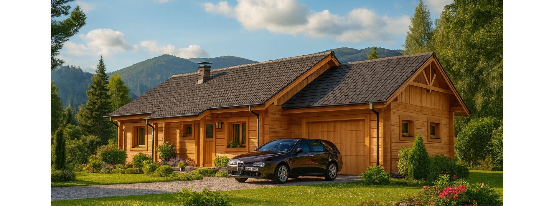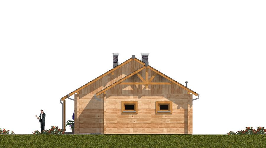 Ten parterowy dom z bala został zaprojektowany z myślą o rodzinach z dziećmi, które nie potrzebują ogromnych przestrzeni, ale cenią komfort, ciepło i przytulną atmosferę. Dzięki zastosowaniu drewna jako głównego materiału konstrukcyjnego, wnętrze domu ma wyjątkowy mikroklimat, sprzyjający codziennemu odpoczynkowi. Strefa dzienna W części dziennej domownicy mają do dyspozycji: Przestronny pokój dzienny z aneksem kuchenno-jadalnym, Miejsce na komplet wypoczynkowy, z którego widać kominek, zapewniający przyjemne ciepło w chłodniejsze dni, Miejsce na sprzęt audio-wizualny, np. komodę z telewizorem i sprzętem multimedialnym, Zadaszony taras z szerokim wyjściem z pokoju dziennego, co pozwala cieszyć się kontakt z otoczeniem niezależnie od pogody. Strefa nocna Przez hol prowadzi droga do części nocnej domu, obejmującej: Trzy komfortowe sypialnie, Łazienkę, Wszystkie pomieszczenia mają duże okna, dzięki którym wnętrze jest jasne i przytulne. Garaż i pomieszczenia gospodarcze Duży garaż znajduje się oddzielnie od części mieszkalnej, Może służyć również jako pomieszczenie gospodarcze i miejsce na narzędzia ogrodowe. Zalety technologii z bala Naturalny mikroklimat drewna, Doskonała izolacja termiczna i akustyczna, Estetyczny wygląd elewacji i wnętrza, Dom ciepły, przyjazny i ekologiczny.