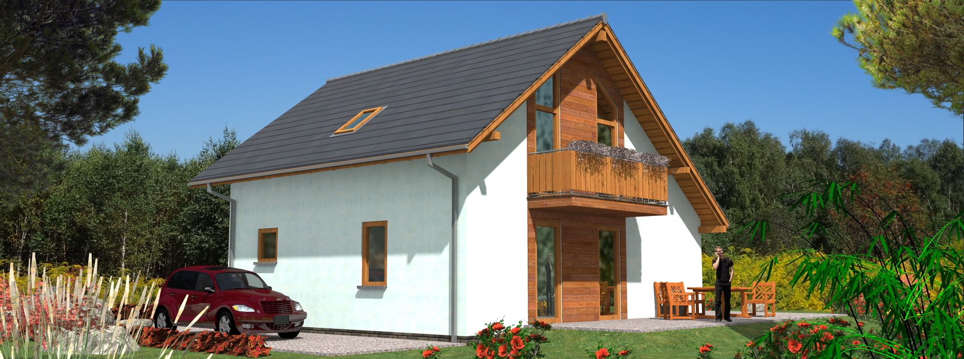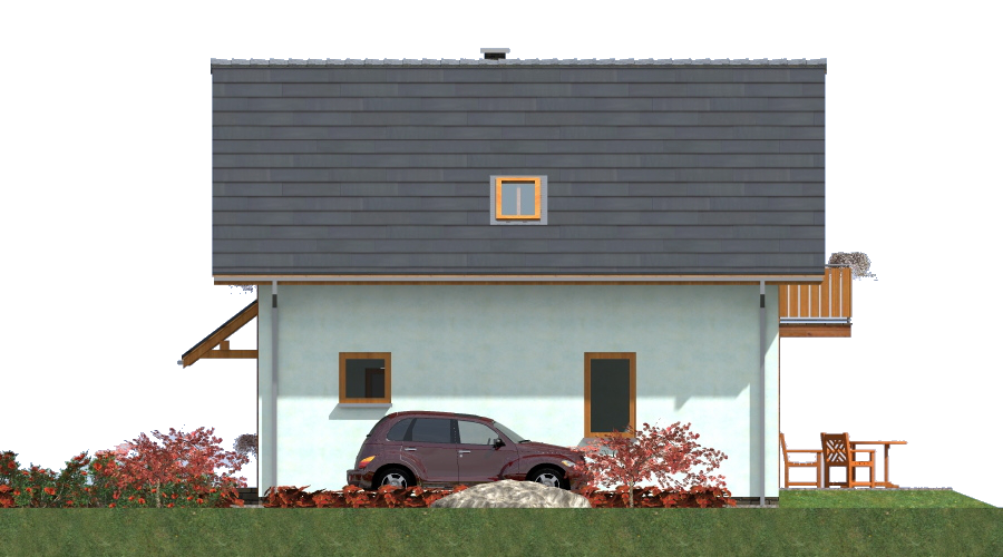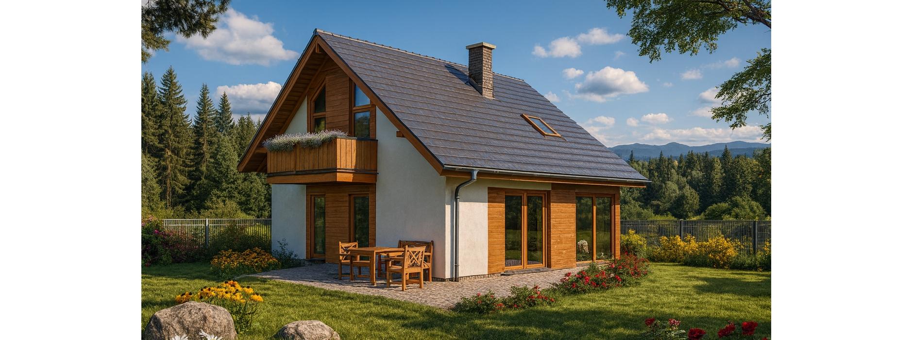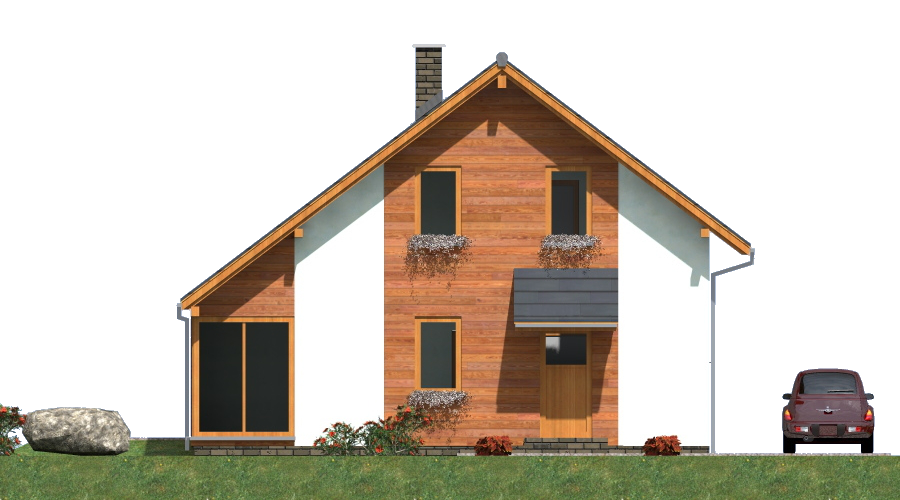 Parterowy dom szkieletowy z poddaszem – nowoczesność, funkcjonalność i ekonomia Ten dom szkieletowy z poddaszem użytkowym charakteryzuje się zwartą bryłą i oszczędną, nowoczesną elewacją, która wyróżnia go na tle innych budynków. Prosta, minimalistyczna forma zewnętrzna łączy się z wnętrzem pełnym przestrzeni, światła i komfortu – dzięki dużym przeszkleniom i otwartym przestrzeniom, które zapewniają naturalne doświetlenie oraz bezpośredni kontakt z otoczeniem. Nowoczesne wnętrze z podziałem na strefy W budynku zastosowano wyraźny podział na część dzienną i nocną, co zwiększa funkcjonalność i wygodę mieszkańców: Parter: przestronny pokój dzienny z otwartą kuchnią i aneksem jadalnym w strefie ogólnodostępnej, duża sypialnia dla rodziców lub gości, łazienka, pomieszczenia jasne i przeszklone, zapewniające pełen kontakt z otoczeniem, Poddasze: trzy komfortowe sypialnie, łazienka, brak zbędnych korytarzy i marnowania przestrzeni, co sprawia, że dom jest niezwykle funkcjonalny. Zalety technologii szkieletowej Budowa domu w technologii szkieletowej zapewnia liczne korzyści: Ekonomiczne użytkowanie – niższe koszty ogrzewania i utrzymania domu, Szybka realizacja inwestycji – dzięki prefabrykowanym elementom budowa przebiega sprawnie i bez zbędnych opóźnień, Elastyczność projektowa – lekka konstrukcja umożliwia łatwe adaptacje wnętrza oraz dowolne rozmieszczenie okien i drzwi, Możliwość całorocznego użytkowania lub wykorzystania domu jako letniskowego. Dlaczego warto wybrać ten dom szkieletowy? Ten parterowy dom szkieletowy z poddaszem jest idealny dla rodzin szukających nowoczesnego, funkcjonalnego i ekonomicznego domu. Jasne, przeszklone wnętrza i otwarte przestrzenie zapewniają komfort życia, a dobrze zaplanowane strefy dzienne i nocne zwiększają wygodę codziennego użytkowania. Zaletą jest również szybka i tania budowa dzięki technologii szkieletowej, co sprawia, że jest to rozwiązanie idealne dla inwestorów ceniących czas, oszczędność i jakość.