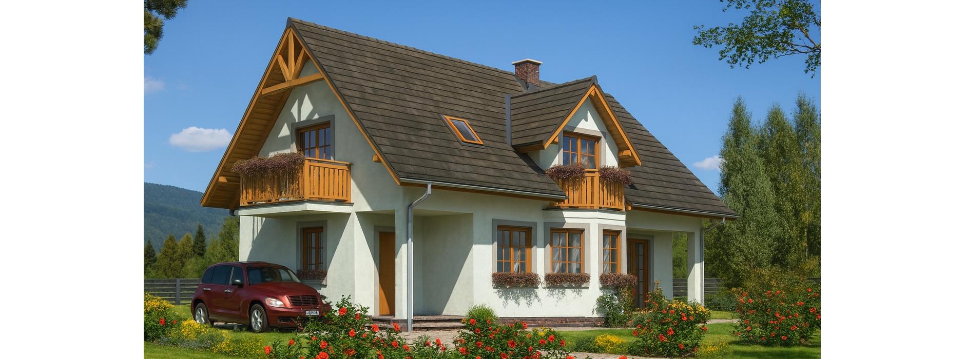 Parterowy dom szkieletowy z poddaszem – funkcjonalność i nowoczesna architektura Ten parterowy dom szkieletowy z poddaszem użytkowym został zaprojektowany z myślą o maksymalnej funkcjonalności i estetyce. Budynek idealnie nadaje się na działki, gdzie konieczne jest przewidzenie tarasu od strony wejścia, a dzięki przemyślanej konstrukcji pokój dzienny może posiadać taras z dwóch stron, co zwiększa komfort użytkowania i kontakt z otoczeniem. Architektura i design Budynek łączy prostotę architektoniczną z nowoczesnymi detalami. Dzięki wykuszowi, lukarnie oraz balkonom będzie się wyróżniał na tle innych domów w sąsiedztwie. Duże przeszklenia w salonie oraz balkony przy sypialniach zapewniają doskonałe doświetlenie wnętrz i kontakt z naturą. Funkcjonalne wnętrze Pokój dzienny z możliwością wyjścia na taras z dwóch stron, Oddzielna, przestronna kuchnia, która ułatwia codzienne przygotowywanie posiłków, Gabinet na parterze, idealny do pracy zdalnej lub nauki, Pomieszczenia gospodarcze i garderoby, zapewniające porządek i wygodę mieszkańców, Łazienka na parterze dla gości lub domowników. Strefa nocna Na poddaszu zaplanowano trzy komfortowe sypialnie, każda z własnym balkonem i garderobą. Dodatkowo przewidziano łazienkę dostępna dla wszystkich domowników. Indywidualne balkony pozwalają każdemu mieszkańcowi odprężyć się na świeżym powietrzu w dowolnej porze dnia, a jednocześnie zapewniają prywatność. Zalety technologii szkieletowej Ekonomiczny w użytkowaniu – niższe koszty ogrzewania i eksploatacji, Szybka budowa w porównaniu do tradycyjnych technologii murowanych, Lekka konstrukcja umożliwiająca łatwe adaptacje wnętrza, Możliwość całorocznego użytkowania domu lub wykorzystania go jako domu letniskowego. Podsumowanie Ten dom szkieletowy z poddaszem to propozycja dla rodzin poszukujących połączenia nowoczesnej architektury, funkcjonalności i komfortu życia. Doskonale sprawdzi się zarówno na działkach z ograniczeniami przestrzennymi, jak i w tradycyjnym otoczeniu, oferując przestronne wnętrza, liczne tarasy i balkony oraz ekonomiczne użytkowanie.