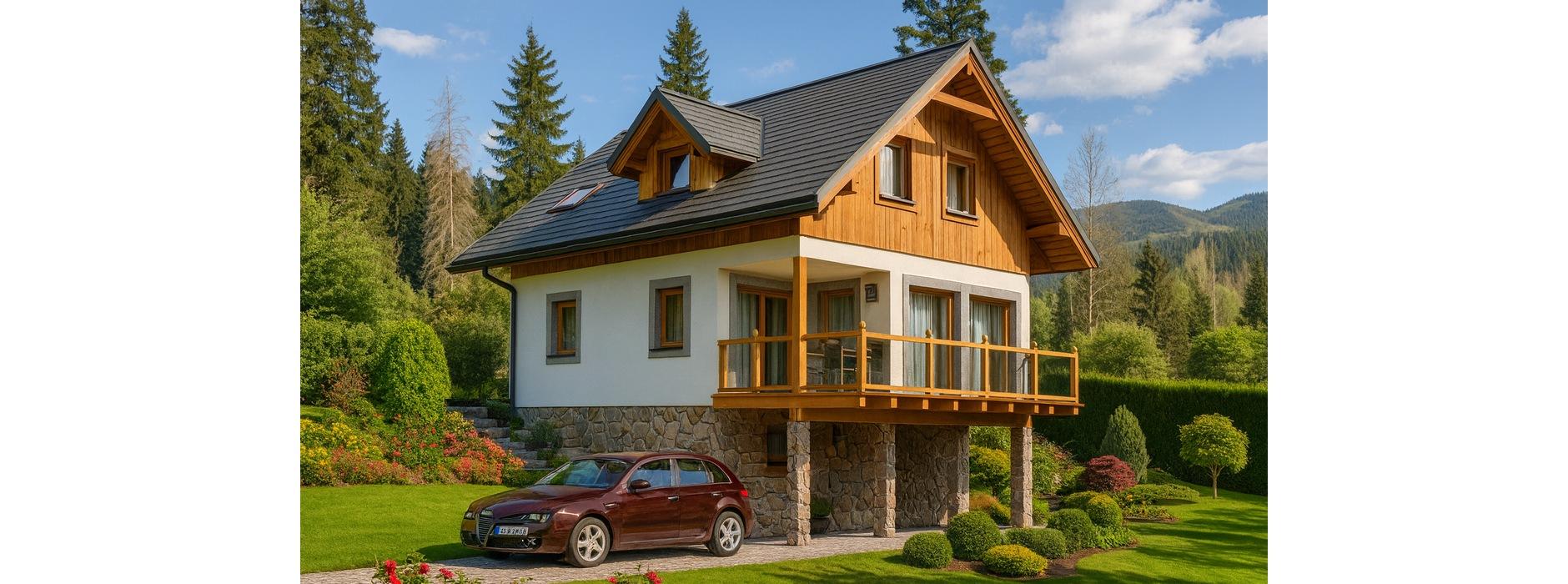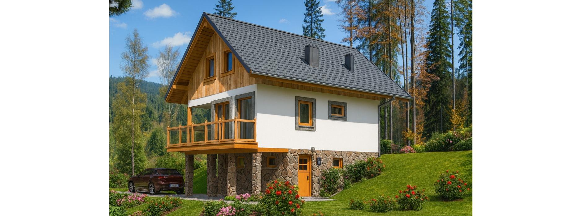 Prezentowany projekt domu szkieletowego został zaprojektowany z myślą o działkach ze spadkiem, co pozwala w pełni wykorzystać naturalne ukształtowanie terenu. Dzięki takiemu rozwiązaniu mieszkańcy mogą cieszyć się przepięknym widokiem z przestronnego tarasu oraz przeszklonego pokoju dziennego, w którym zaplanowano także miejsce na kominek. Dom zaprojektowano jako obiekt wolnostojący, który może być użytkowany zarówno jako dom całoroczny, jak i komfortowy dom letniskowy. Budynek jest parterowy, częściowo podpiwniczony, z poddaszem użytkowym i dachem dwuspadowym o kącie nachylenia 40°. Funkcjonalny układ wnętrz Parter to strefa dzienna – z wiatrołapu prowadzi wejście do hallu, stanowiącego główny trzon komunikacyjny domu. Z niego dostępny jest salon z kominkiem i wyjściem na taras, jasna kuchnia oraz łazienka. Schody prowadzą na poddasze użytkowe. Poddasze zaprojektowano jako strefę nocną. Z niewielkiego hallu przewidziano wejście do trzech wygodnych sypialni, które zapewniają komfort domownikom. Piwnica mieści pomieszczenie gospodarcze, a pod tarasem przewidziano miejsce postojowe dla samochodu, co jest praktycznym rozwiązaniem szczególnie na działkach o zróżnicowanej rzeźbie terenu. Atuty domu szkieletowego Dom wykonany w technologii szkieletowej to: energooszczędność i ekonomia w użytkowaniu, krótki czas budowy, doskonała izolacja cieplna i akustyczna, możliwość łatwej rozbudowy i adaptacji projektu. Ten dom szkieletowy z poddaszem i tarasem to propozycja dla osób, które cenią funkcjonalność, nowoczesne rozwiązania oraz ekonomię użytkowania.