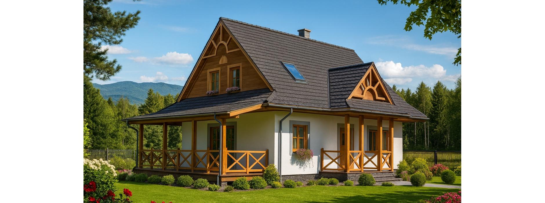 Projekt domu szkieletowego łączącego nowoczesność z tradycją to propozycja dla osób, które cenią górski styl architektury, ale oczekują jednocześnie funkcjonalnych rozwiązań współczesnego budownictwa. Bryła budynku nawiązuje do regionalnej stylistyki, wzbogaconej o duże przeszklenia i przestronny, częściowo zadaszony taras, który zapewnia idealne połączenie wnętrza z ogrodem. Funkcjonalny układ wnętrz Wnętrze domu zaprojektowano w sposób otwarty i nowoczesny. Strefa dzienna znajduje się na parterze – duży pokój dzienny płynnie łączy się z kuchnią i holem, co sprawia, że cała przestrzeń jest jasna, przestronna i sprzyja wspólnemu spędzaniu czasu. W salonie zaplanowano kominek, który dodaje wnętrzu przytulności i zapewnia ciepło w chłodniejsze dni. Z salonu można wyjść na taras drewniany z częściowym zadaszeniem, idealny do wypoczynku na świeżym powietrzu przez cały sezon. Na parterze przewidziano również dodatkową sypialnię, łazienkę oraz pomieszczenie gospodarcze zwiększające funkcjonalność budynku. Na poddaszu znajduje się strefa nocna – trzy przestronne sypialnie, łazienka i niewielka garderoba, połączone wygodnym hallem. Atuty technologii szkieletowej Dom zaprojektowany w technologii szkieletowej to inwestycja gwarantująca: wysoką energooszczędność i ekonomiczne utrzymanie, szybki czas budowy w porównaniu z domami murowanymi, trwałość i bezpieczeństwo konstrukcji, przyjazny mikroklimat dzięki zastosowaniu naturalnych materiałów. Ten nowoczesny dom szkieletowy z poddaszem i tarasem sprawdzi się doskonale jako dom całoroczny lub dom wakacyjny w górach czy na działce z pięknym widokiem.