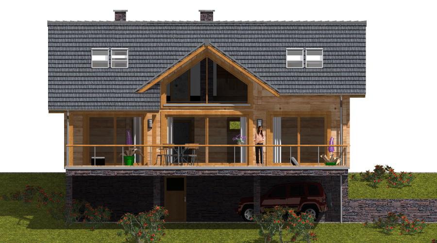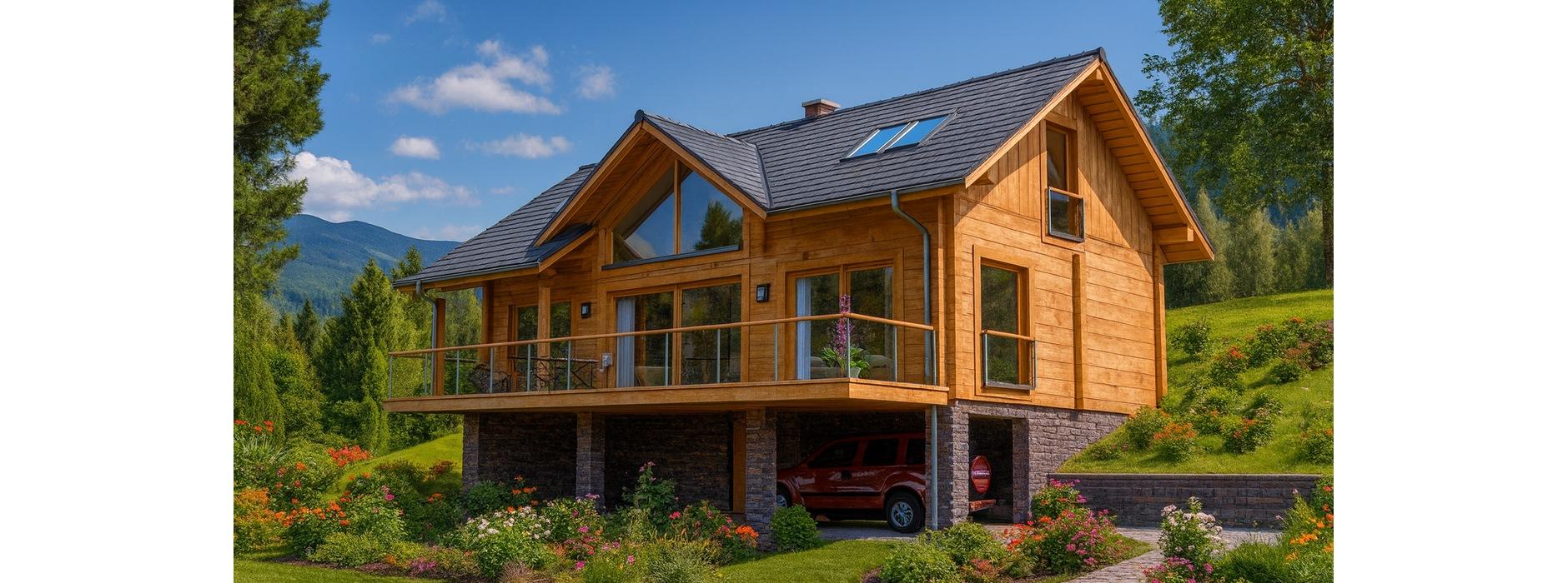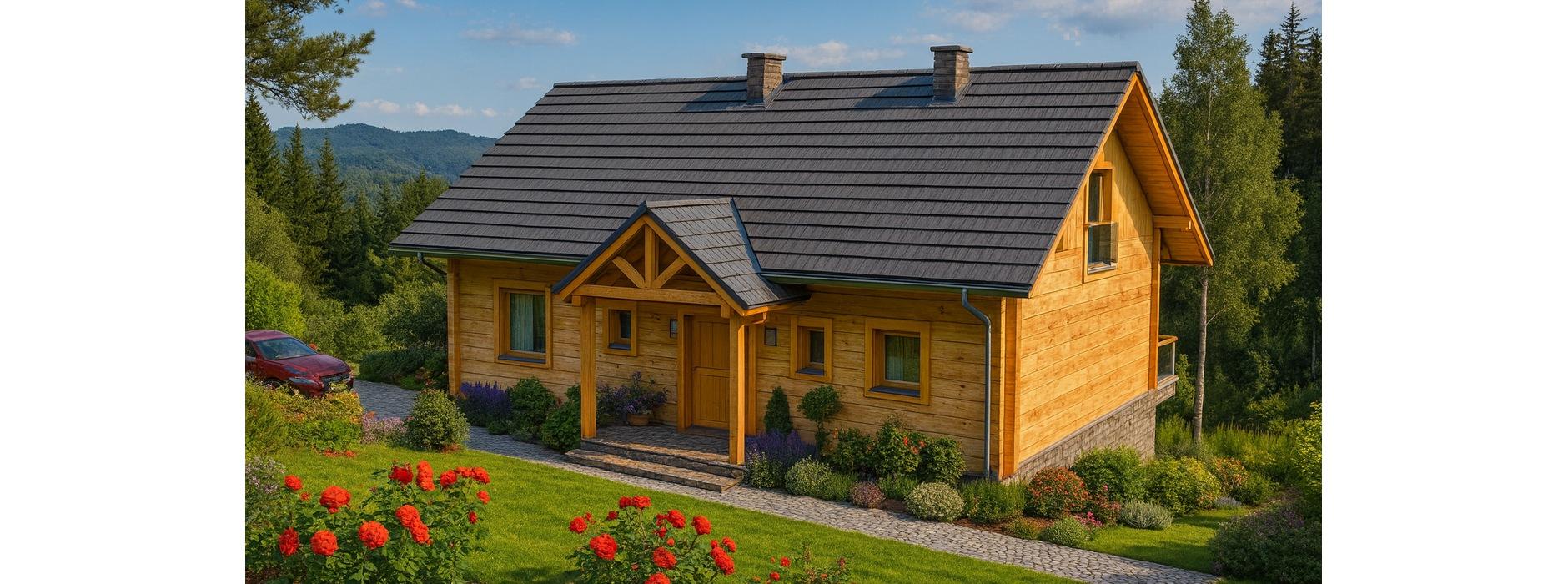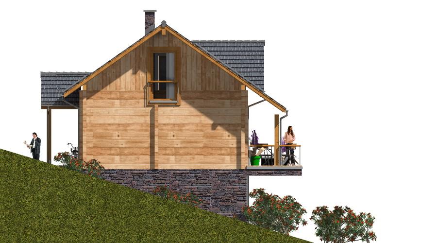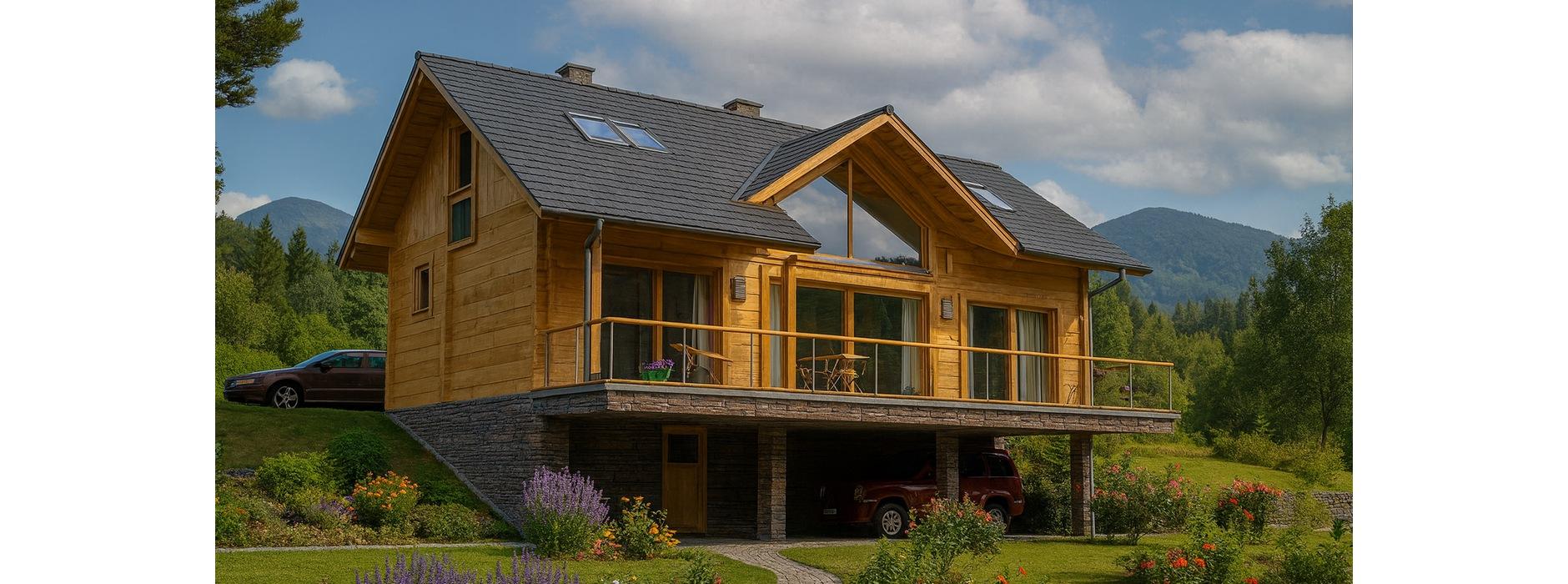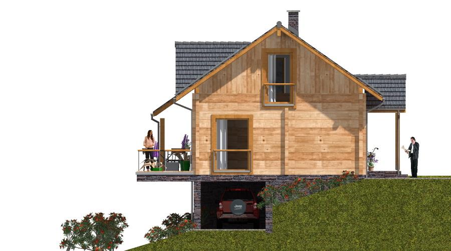 Projekt domu z bala usytuowanego na działce ze spadkiem to propozycja dla osób ceniących tradycyjne budownictwo drewniane w nowoczesnej formie. Dzięki położeniu budynku na zróżnicowanym terenie mieszkańcy mogą cieszyć się pięknymi panoramami z tarasu oraz przeszklonego salonu, kuchni i jadalni. Układ pomieszczeń Dom zaprojektowano jako wolnostojący, parterowy, z użytkowym poddaszem, piwnicą i dachem dwuspadowym o kącie 35°. Parter pełni rolę strefy dziennej – z wiatrołapu wchodzimy do hallu, z którego dostępne są: jasny pokój dzienny z kominkiem i wyjściem na taras, otwarta kuchnia z jadalnią, łazienka oraz sypialnia. Na poddaszu przewidziano dwie przytulne sypialnie z garderobami, połączone niewielkim hallem, co zapewnia domownikom komfort i prywatność. Piwnica mieści pomieszczenie gospodarcze oraz otwarte miejsca postojowe, idealne do przechowywania sprzętu i pojazdów. Atuty technologii z bala Wybór konstrukcji z bala sprawia, że dom: oferuje naturalny mikroklimat sprzyjający zdrowiu, jest ciepły zimą i przyjemnie chłodny latem, ma unikalny charakter dzięki naturalnemu drewnu, wyróżnia się trwałością i wyjątkowym stylem architektonicznym. Ten dom z bala z tarasem i użytkowym poddaszem to doskonały wybór zarówno jako dom całoroczny, jak i letniskowy. Łączy w sobie urok tradycji z funkcjonalnością nowoczesnych rozwiązań.