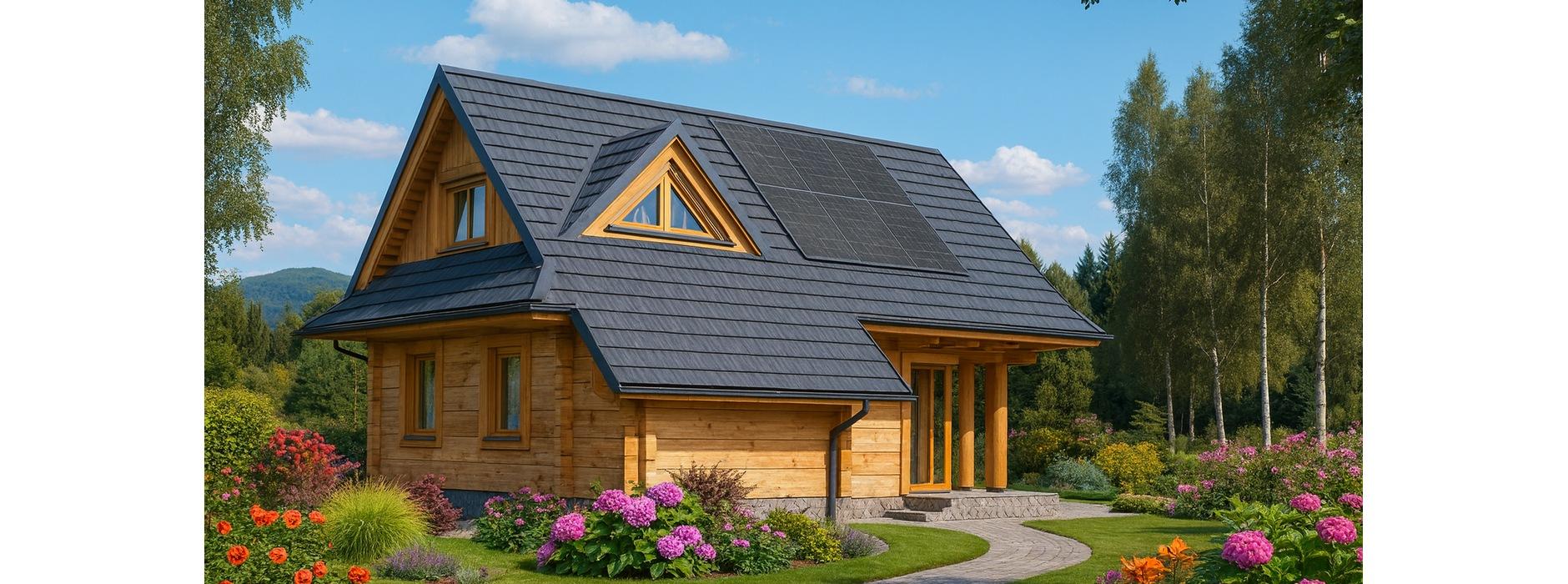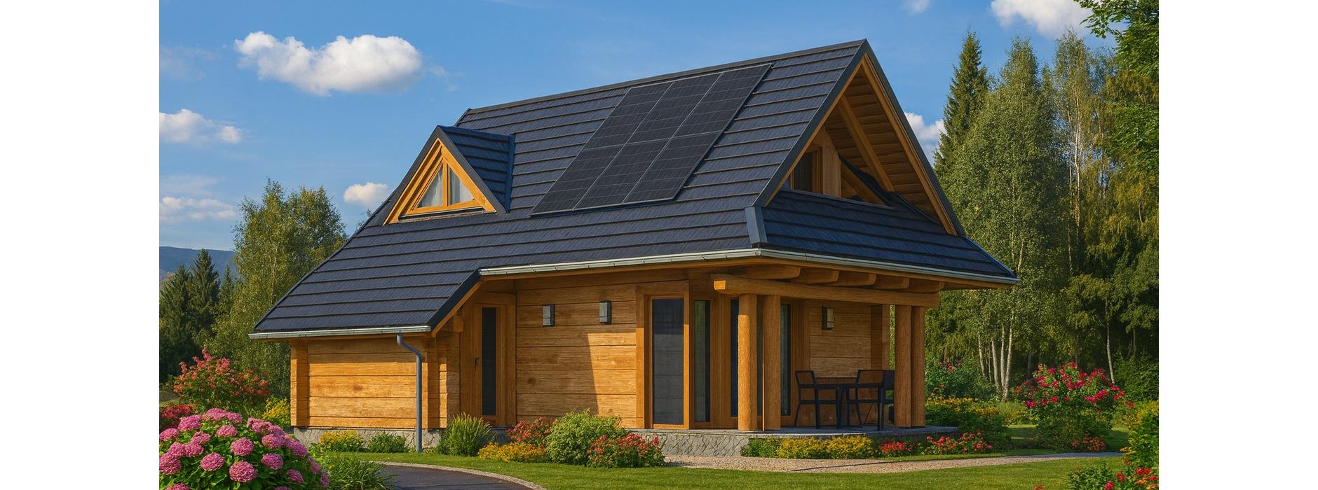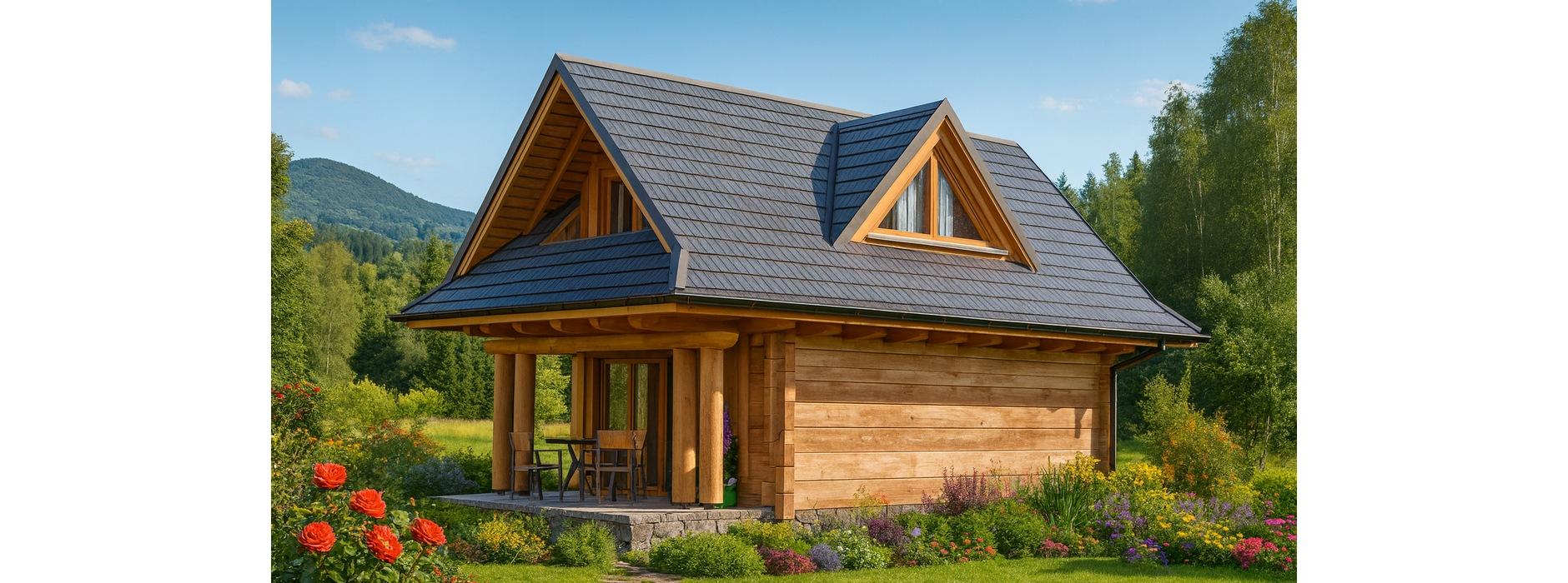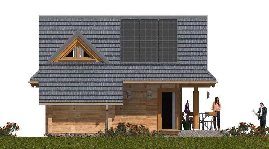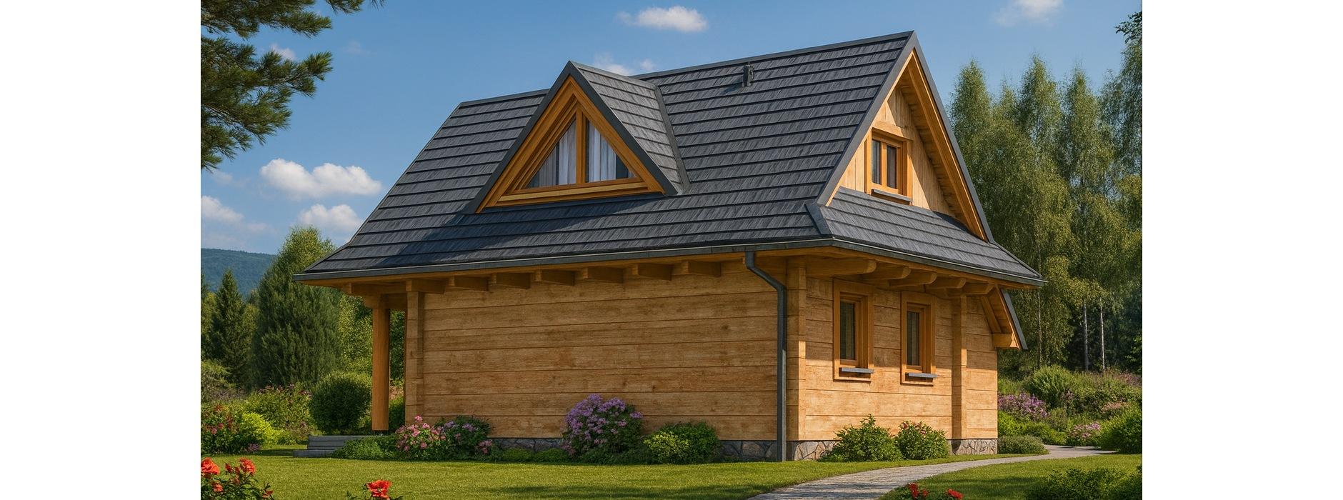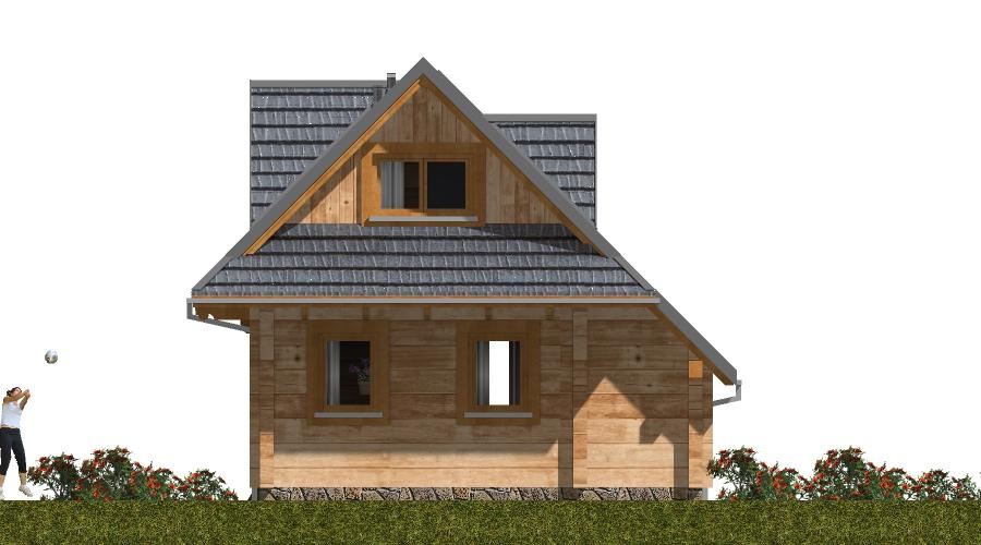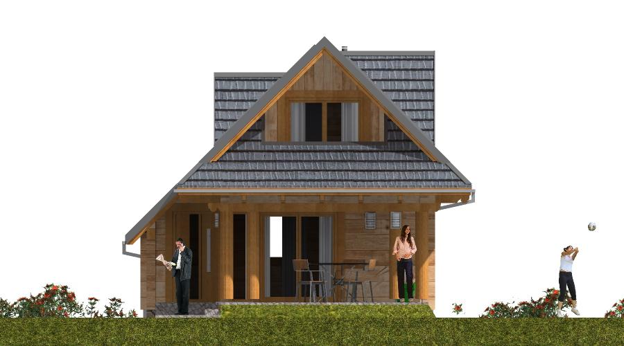 Tradycyjny dom z bala w nowoczesnym wydaniu to projekt, który łączy góralską stylistykę z elementami współczesnej architektury. Bryła nawiązuje do regionalnych domów drewnianych, ale dzięki dużym przeszkleniom, funkcjonalnemu układowi wnętrz i zadaszonemu tarasowi zyskuje nowoczesny charakter. Przestronne i jasne wnętrze Wnętrze domu z bala wyróżnia się niebanalnym układem pomieszczeń. Główną część parteru zajmuje otwarty pokój dzienny połączony z kuchnią, co optycznie powiększa przestrzeń. Duże przeszklenia sprawiają, że wnętrza są jasne i przytulne, a naturalne drewno podkreśla ich wyjątkowy klimat. Salon posiada wyjście na częściowo zadaszony taras, idealny do odpoczynku na świeżym powietrzu, niezależnie od pogody. Strefa prywatna na poddaszu Na poddaszu znajdują się dwie komfortowe sypialnie połączone praktycznym hallem. To idealne rozwiązanie dla rodziny – zapewnia prywatność i wygodę. Zalety technologii z bala Dom wykonany w technologii z bala to inwestycja dla osób ceniących ekologię i naturalne materiały. Drewno zapewnia zdrowy mikroklimat we wnętrzu, regulując wilgotność powietrza. Budynek jest ciepły i energooszczędny, co przekłada się na niższe koszty ogrzewania. Niepowtarzalny wygląd elewacji sprawia, że dom z bala doskonale komponuje się z otoczeniem – szczególnie w górskich lub leśnych krajobrazach. Ten dom z bala z poddaszem i tarasem łączy w sobie urok tradycji i zalety nowoczesnego budownictwa, tworząc wyjątkowe miejsce do życia i wypoczynku.
