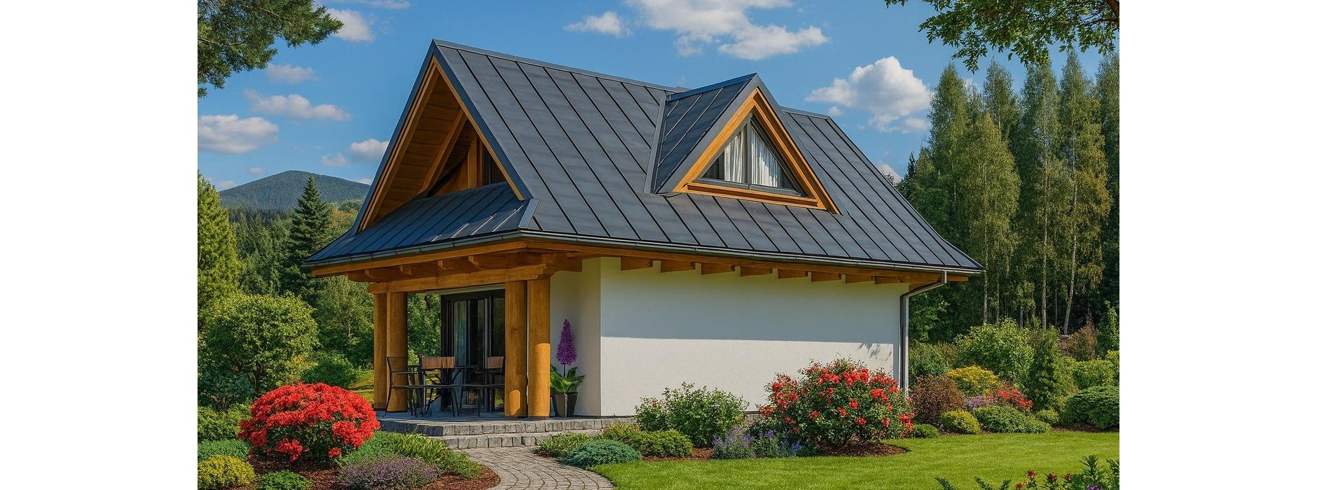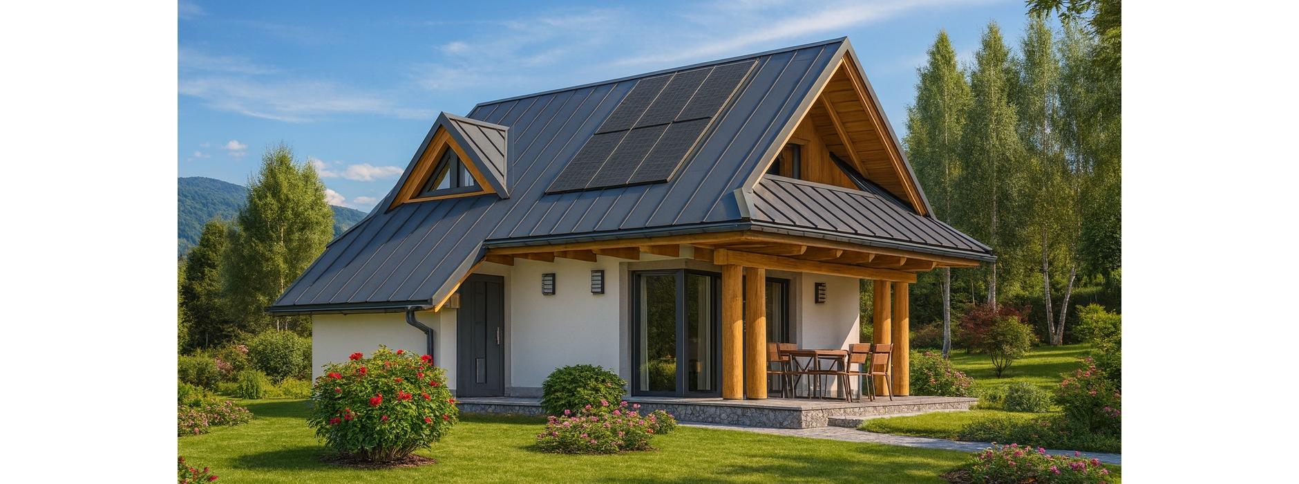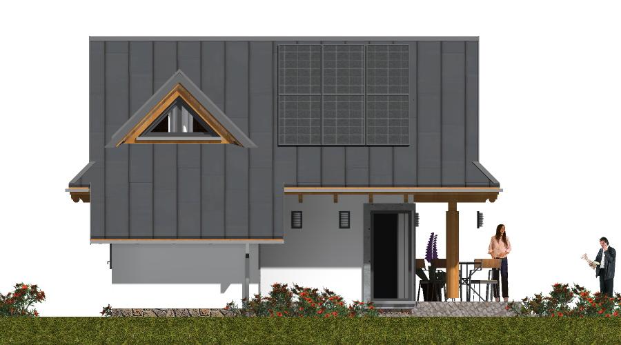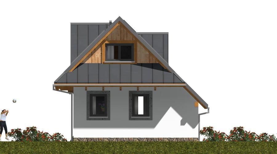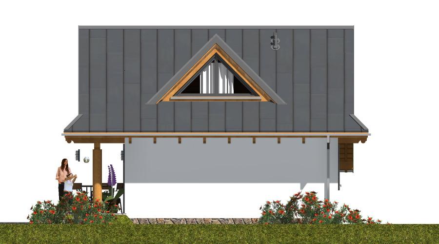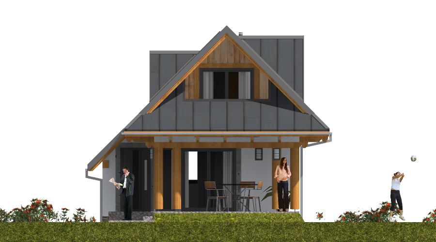 Nowoczesny dom szkieletowy inspirowany architekturą góralską to propozycja dla osób, które chcą połączyć tradycję z komfortem współczesnego budownictwa. Bryła budynku nawiązuje do klasycznych domów regionalnych, a jednocześnie wzbogacona została o duże przeszklenia, przestronny taras i nowoczesne wykończenie. Dzięki temu projekt jest ponadczasowy i atrakcyjny zarówno wizualnie, jak i funkcjonalnie. Funkcjonalny układ wnętrza Wnętrze zaprojektowano tak, aby było otwarte i komfortowe. Główną część parteru zajmuje przestronny pokój dzienny połączony z kuchnią i jadalnią. Dzięki temu cała strefa dzienna jest jasna, przestronna i sprzyja wspólnemu spędzaniu czasu. Duże przeszklenia wpuszczają naturalne światło, tworząc przyjazny mikroklimat. Z salonu prowadzi wyjście na częściowo zadaszony taras, który umożliwia korzystanie z ogrodu niemal przez cały rok. Poddasze – prywatna strefa nocna Na poddaszu zaplanowano dwie wygodne sypialnie oraz funkcjonalny hall, który łączy wszystkie pomieszczenia. Dzięki temu prywatna część domu jest kameralna i dobrze oddzielona od strefy dziennej. Atuty technologii szkieletowej Dom zaprojektowano w technologii szkieletowej, co ma wiele zalet: szybki czas budowy i możliwość realizacji w niemal każdych warunkach, wysoka energooszczędność i świetna izolacja cieplna, ekologiczność – drewno jako materiał odnawialny, możliwość dowolnej aranżacji wnętrz i łatwe wprowadzanie zmian. Ten dom szkieletowy z poddaszem i tarasem to idealna propozycja zarówno jako dom całoroczny dla rodziny, jak i jako komfortowy dom letniskowy w górach lub na wsi.
