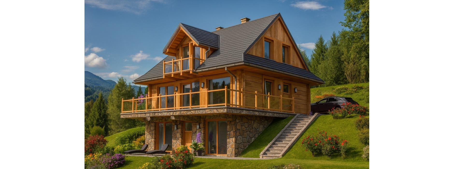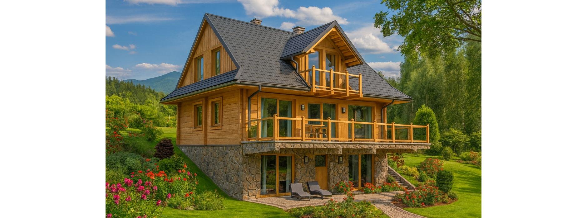 Nowoczesny projekt domu z bali oferuje dwa niezależne mieszkania – jedno rozmieszczone na parterze i poddaszu, a drugie w przyziemiu. Takie rozwiązanie pozwala na wygodne użytkowanie budynku zarówno jako domu jednorodzinnego z dodatkowym apartamentem, jak i jako obiektu wakacyjnego na wynajem. Dom zaplanowano na działce ze spadkiem, dzięki czemu taras oraz przeszklony salon z jadalnią zapewniają panoramiczny widok na otoczenie. Jest to budynek wolnostojący, parterowy, z poddaszem użytkowym i dachem dwuspadowym o kącie nachylenia 42°. Na parterze znajduje się część dzienna – hall łączący wszystkie pomieszczenia, przestronny salon z kominkiem i wyjściem na taras, kuchnia, łazienka oraz schody prowadzące na poddasze. Strefę nocną na poddaszu tworzą trzy wygodne sypialnie oraz łazienka. Drugi lokal mieszkalny umieszczono w przyziemiu. Składa się on z pokoju dziennego, sypialni, aneksu kuchennego i łazienki. Co ważne, dostęp do tego mieszkania możliwy jest także z parteru dzięki wewnętrznej klatce schodowej. Dom z bali to rozwiązanie ekologiczne i zdrowe, które gwarantuje mieszkańcom przytulny klimat, wysoką izolacyjność cieplną i możliwość użytkowania budynku przez cały rok