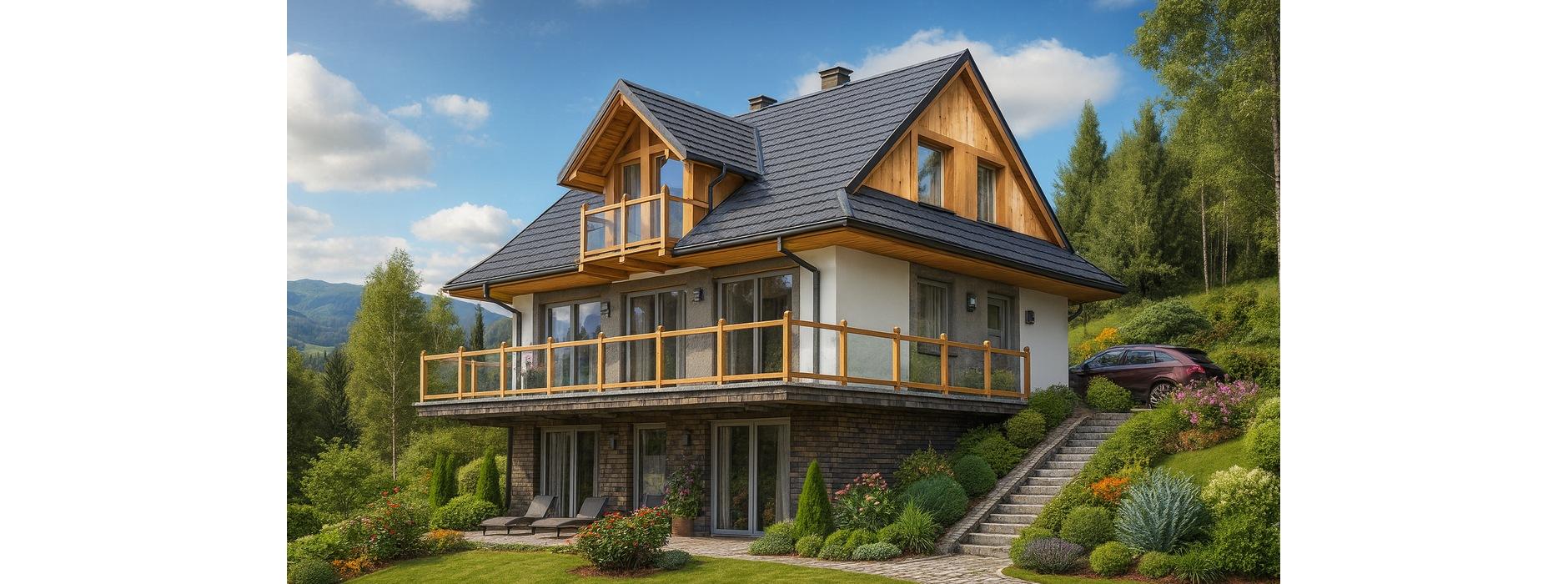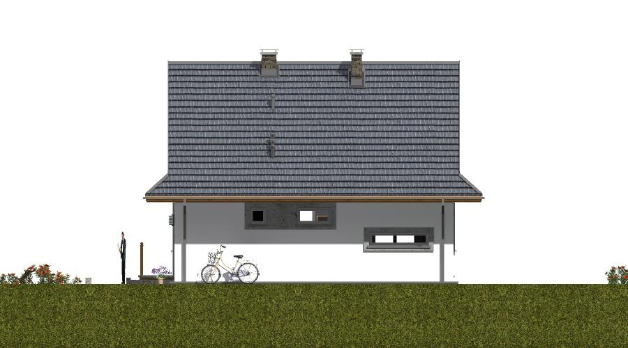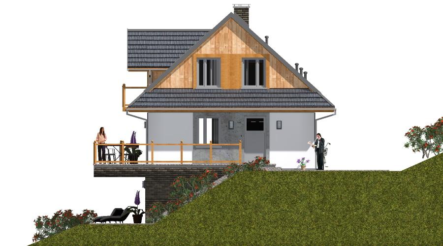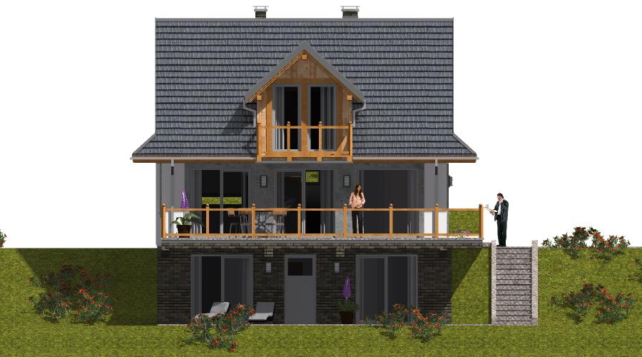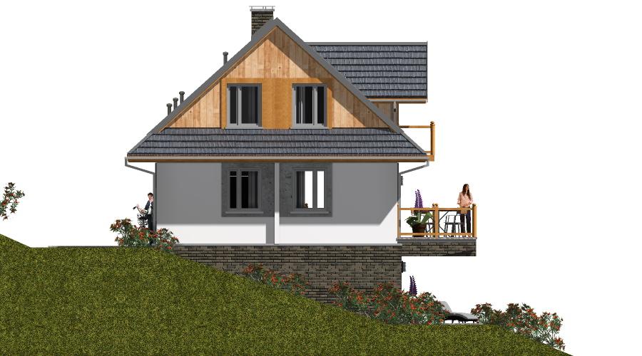 Projekt domu obejmuje dwa całkowicie niezależne lokale mieszkalne. Pierwsze mieszkanie znajduje się na parterze i poddaszu, natomiast drugie zostało zaprojektowane w przyziemiu. Dzięki takiemu układowi budynek może pełnić funkcję zarówno domu całorocznego, jak i komfortowego domu letniskowego. Budynek usytuowany jest na działce z dużym spadkiem terenu, co umożliwia podziwianie pięknych widoków z tarasu oraz z przestronnego, przeszklonego salonu połączonego z jadalnią. Dom zaprojektowano jako obiekt wolnostojący, parterowy, z użytkowym poddaszem i dachem dwuspadowym o kącie nachylenia 42°. Parter stanowi strefę dzienną – z wiatrołapu prowadzi wejście do hallu, z którego dostępny jest salon z miejscem na kominek i wyjściem na taras, kuchnia, łazienka oraz schody na poddasze. Na poddaszu zaplanowano część nocną: trzy sypialnie i łazienkę. W piwnicy mieści się drugi lokal mieszkalny z własnym pokojem dziennym, sypialnią, aneksem kuchennym i łazienką. Mieszkanie w przyziemiu ma także dodatkowe połączenie z parterem poprzez wewnętrzną klatkę schodową. Dom przewidziano w technologii z bala, co sprawia, że jest wyjątkowo przyjazny dla mieszkańców i w pełni wpisuje się w charakter budownictwa energooszczędnego.